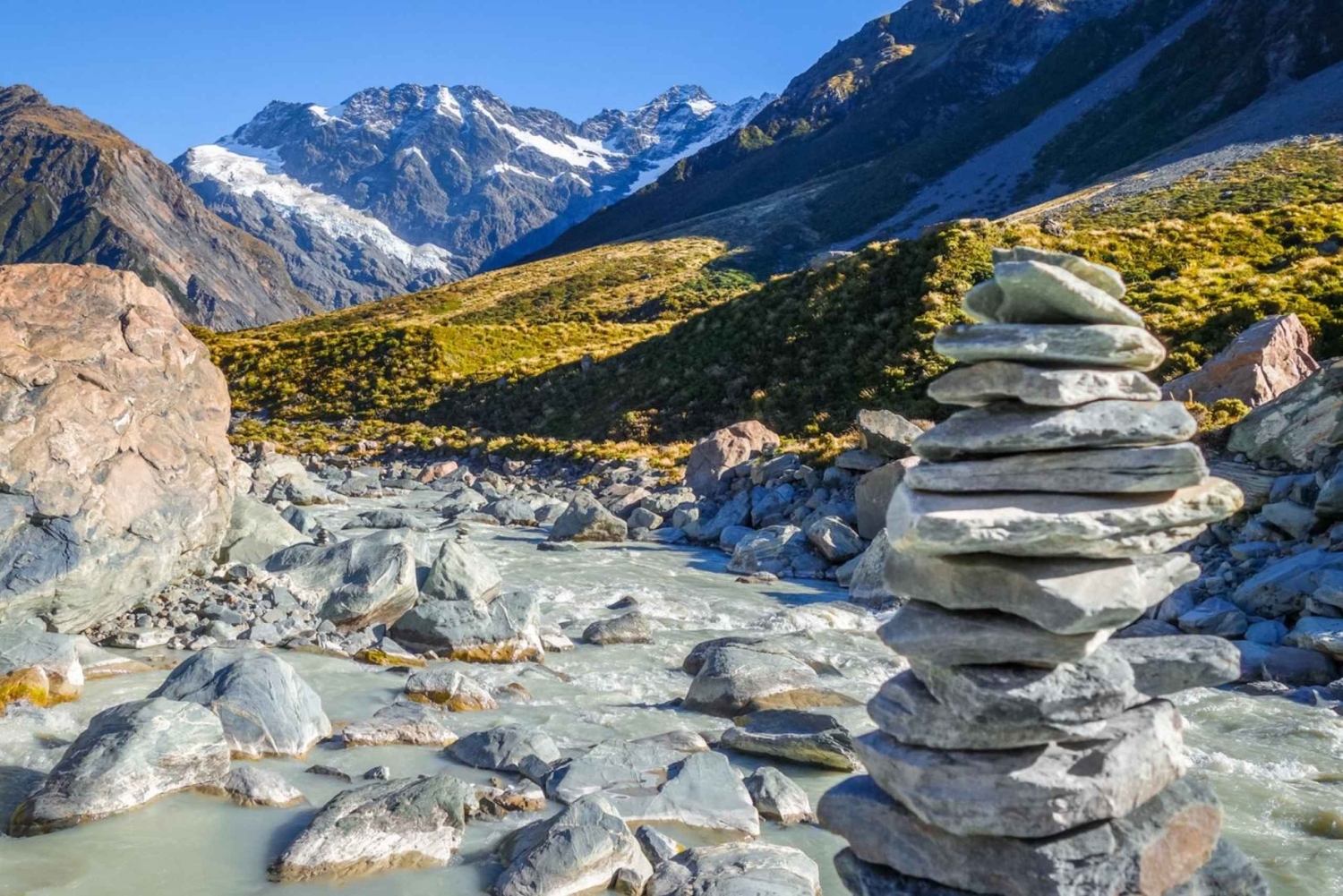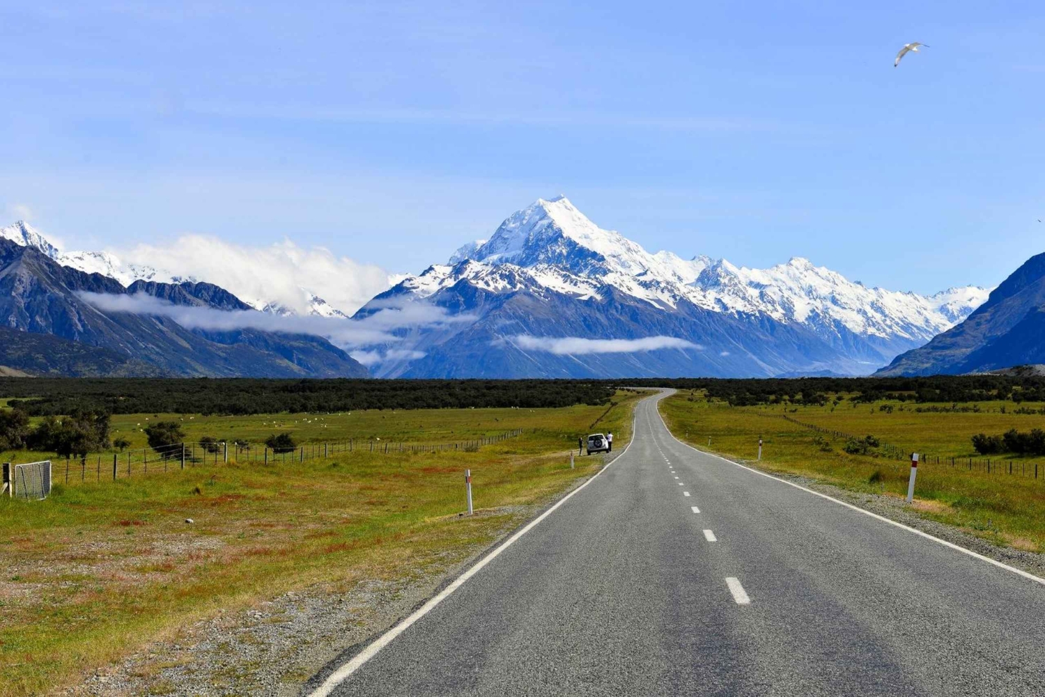 Fahre weiter und erlebe ein ganztägiges Abenteuer am türkisfarbenen Wasser von Tekapo und Pukaki, das von schneebedeckten Gipfeln umgeben ist. Besuche die berühmte Kirche des Guten Hirten, genieße optionale Aktivitäten deiner Wahl in Tekapo und fahre weiter zum Mount. Cook-Nationalpark. Erkunde kurze Wanderwege wie das Hooker Valley (wenn es die Zeit erlaubt) oder genieße einfach die majestätische Aussicht auf die Alpen, bevor du nach Queenstown zurückkehrst.