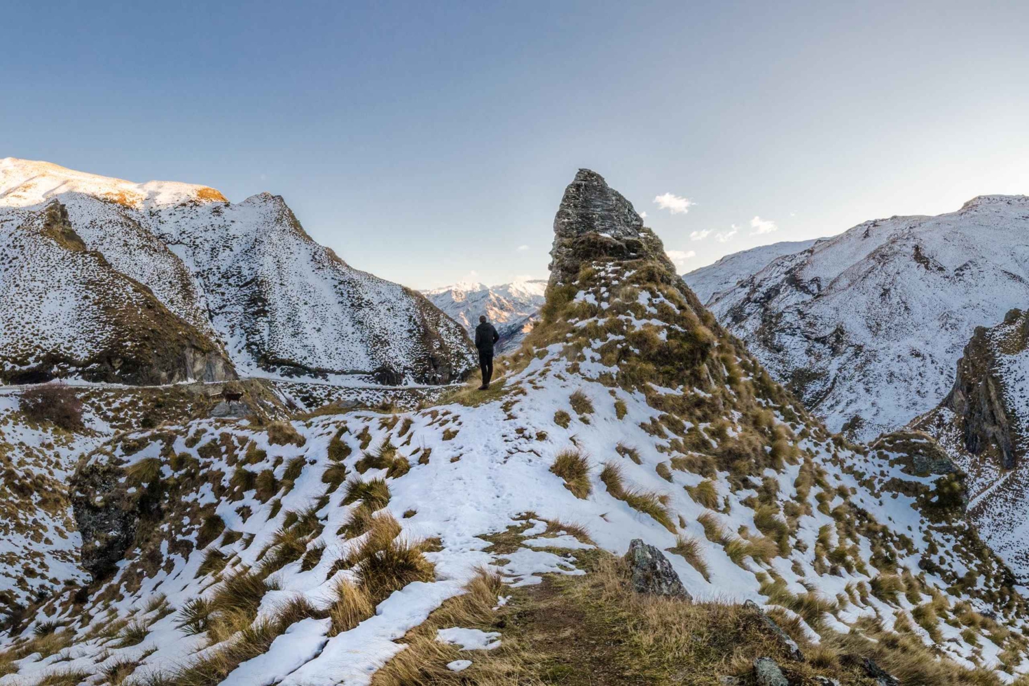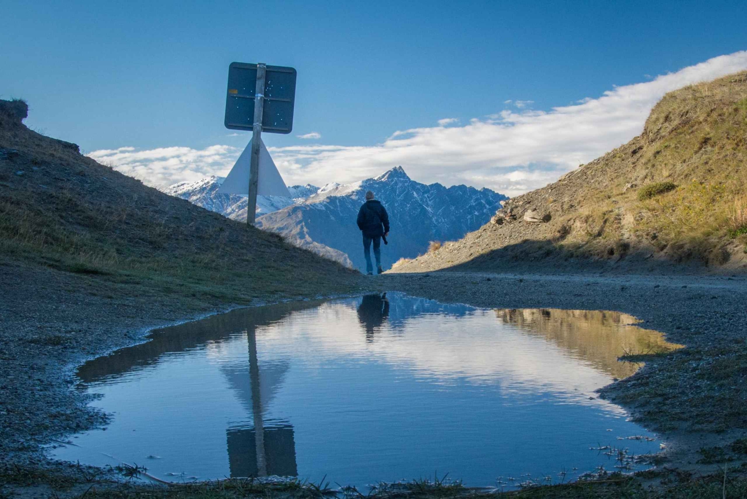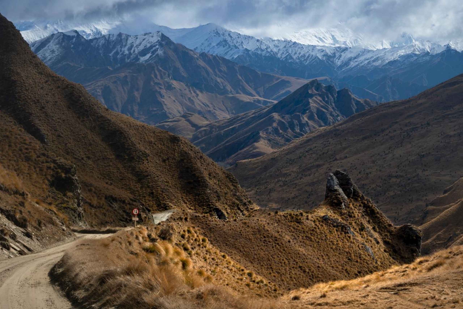 Te recogeremos en tu alojamiento en Queenstown o cerca de allí en un cómodo AWD. Un corto trayecto en coche nos aleja del bullicio del centro de la ciudad a través de un ondulado paisaje rural hasta Skippers Saddle, en lo alto de la carretera que lleva al campo de esquí de Coronet Peak. Este es el comienzo de un camino de tierra de 22 km, labrado hace más de ciento treinta años a través de las montañas y el campo para llegar a los ricos yacimientos de oro del río Shotover.
